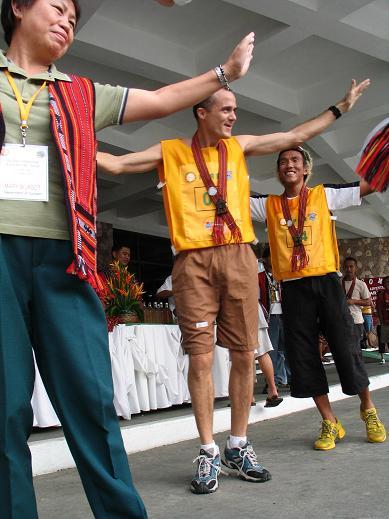 Day Two: May 8,2005: Members of Cebu Black Shama Team dancing in Banaue Hotel welcome party (note: Cebu Black Shama is no longer part of the race)